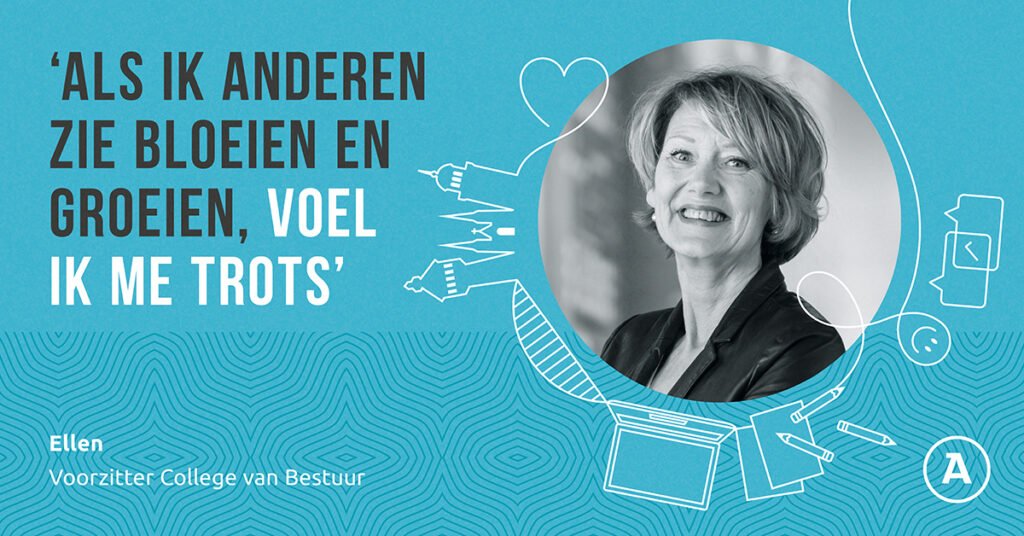 Sinds september 2022 is Ellen voorzitter van het college van bestuur. “Ik begon mijn werkende leven als administratieve kracht, dus ik ben niet iemand die vanuit de schoolbanken meteen bestuurder is geworden. Ik kwam op redelijke jonge leeftijd in leidinggevende functies terecht en werd gezien door de mensen om mij heen. Zij gaven mij vervolgens de kans om me verder te ontwikkelen. Ik weet dus hoe belangrijk het is dat je gezien wordt. In mijn huidige rol als bestuurder probeer ik ook oog te houden voor mensen en wat zij nodig hebben in hun ontwikkeling. Werken voor en met mensen en niet ‘regeren’ vanaf de vierde verdieping.”