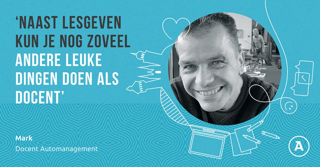 Mark kwam als zij-instromer het onderwijs in. Daar is hij tot op de dag van vandaag nog steeds erg blij mee. “Ik vind het werk hartstikke leuk: de omgang met studenten, mijn kennis delen en dat je aan het begin van de dag niet exact weet hoe de dag verder gaat lopen. Daarnaast is de sfeer binnen Aventus heel fijn, met studenten, maar ook met collega’s. Iedereen is in voor een praatje”, vertelt hij. Het eerste jaar gaf Mark lessen autotechniek, nu geeft hij alweer een aantal jaar automanagement. “Wij leiden de receptionisten en verkopers van een autobedrijf op. Dus eigenlijk het visitekaartje van zo’n bedrijf: de medewerkers met de schone handen.”