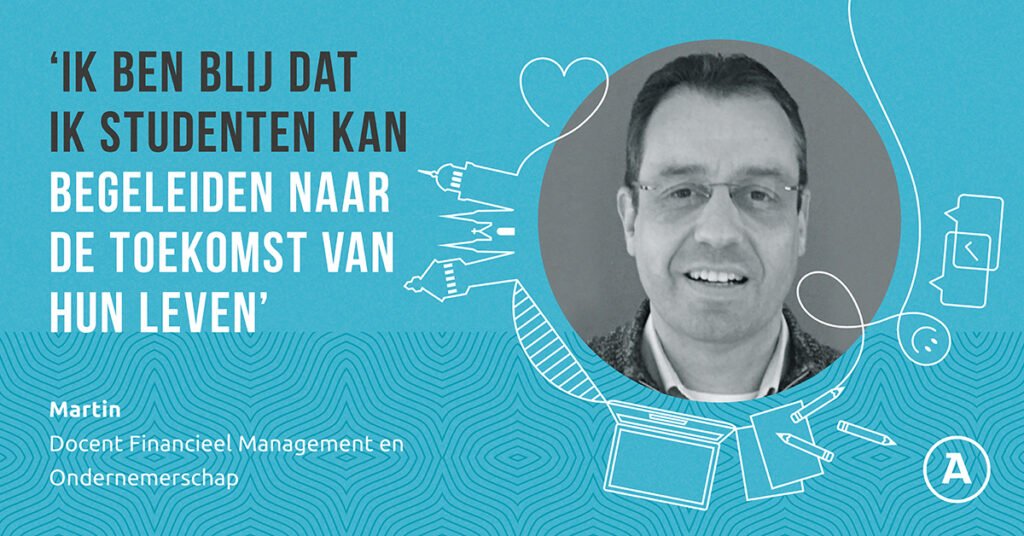 Martin geeft het vak Ondernemerschap en Financieel Management, dat laatste vinden veel studenten niet altijd het leukste. “Ze vinden het vaak moeilijk”, legt hij uit. “Dus probeer ik het zo leuk mogelijk te maken. Alleen al door studenten zo veel mogelijk te betrekken in mijn lessen. Niet alleen zenden, maar ook vragen stellen. Hoe denk jij hierover? Heb je van dit begrip al een keer gehoord? Ook levendige voorbeelden uit de praktijk gebruiken, helpt studenten te motiveren voor het vak.”
